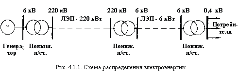 Известно, что передача электроэнергии на дальние расстояния осуществляется на высоком напряжении (220, 400, 500 кВ и более), благодаря чему значительно уменьшаются потери энергии в линии (рис. 4.1.1).