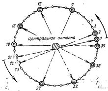 Авс = φр - φоп. В реальных маяках механическое вращение боковой антенны А1 заменяется последовательным подключением вибраторов, расположенных на окружности заданного радиуса R (рис.53). Радиус окружности R = 6,6м, количество вибраторов N = 39. Вибраторы работают попарно (1-21;2-22; …12-32;19-39).