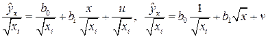 4.2. Методы смягчения проблемы гетероскедастичности. При установлении гетероскедастичности возникает необходимость преобразования модели с целью устранения этого недостатка. Вид преобразований зависит от того, известны или неизвестны дисперсии А). Если для каждого наблюдения известны значения Рассмотрим парную линейную регрессию