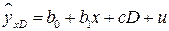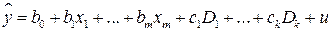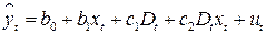 Регрессии отличаются лишь свободными членами. Дальнейшее определение статистической значимости коэффициентов Описанные схемы могут быть распространены на регрессии с произвольным числом количественных и качественных факторов, при этом отметим, что если качественный фактор имеет В рассмотренных выше случаях, предполагалось, что изменение значения качественного фактора влияет лишь на изменение свободного члена. Но существуют ситуации, когда изменение качественного фактора приводит к изменению, как свободного члена уравнения, так и коэффициента регрессии. Это характерно для временных рядов экономических данных при изменении институциональных условий, введении новых правовых или налоговых ограничений. В этом случае уравнение регрессии будет иметь вид: