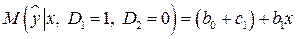 Из моделей (5.2) и (5.3) следует, что значение результативного признака изменяется с одним и тем же коэффициентом пропорциональности Значение фиктивного признака при В регрессионную модель можно вводить произвольное число качественных переменных. Например, регрессионная модель с двумя качественными признаками имеет вид: