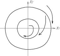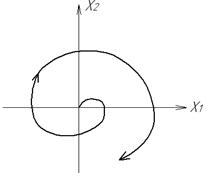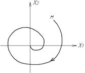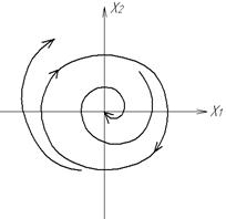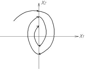 Для НЛС з релейним 2-х позиційним елементом фазовий портрет показаний на рис.1.8. Лінія перемикання співпадає з віссю х2 (х1=0). Для НЛС з релейними елементами існує ковзний режим, коли зображаюча точка переміщується по лінії переключення, наближаючись до початку координат (“ковзає”). Перехідний процес в релейній системі протікає як в неперервній системі. При цьому релейний елемент переключається з достатньо великою частотою, а ковзний режим (коливання навколо лінії переключення) створює ефект вібраційної лінеаризації. Крім метода припасовування (зшивання) для побудови фазових портретів НЛС використовується метод ізоклін – кривих з однаковим нахилом фазових траєкторій, які проходять через точки цих кривих. Головним методом дослідження НЛС є використання ЕОМ: визначається кількість і характер можливих станів рівноваги, кількість граничних циклів і їх взаємне розташування, що дає можливість оцінити сукупність можливих режимів роботи системи. Виконуються також розрахунки для найбільш важливих початкових умов.