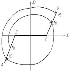 В залежності від особливостей НЛС в них можуть бути автоколивання: - з м’яким режимом збудження, коли після включення завжди система переходить в режим автоколивань не залежно від початкових умов і зовнішніх збурень; - з жорстким режимом збудження, коли для виникнення автоколивань, які відповідають стійкому циклу, необхідно створити достатньо велике початкове відхилення. Наприклад, зображуюча точка знаходиться поза стійким граничним циклом, а під впливом зовнішніх сигналів вона може перейти на цей цикл або переміститись всередину цикла, і автоколивання затухнуть. Фазовий портрет НЛС може мати кусково-лінійні або розривні характеристики, складатись з кількох областей з різними фазовими траєкторіями. В цьому випадку на фазовому портреті є лінії перемикання, які відділяють одну область від іншої. Розроблено метод наближеної побудови фазових портретів НЛС, який дістав назву методу припасовування (зшивання), коли характеристики нелінійностей подаються у вигляді кусково-лінійних залежностей (ламаною лінією). Це відповідає тому, що в правій частині рівняння фазових траєкторій буде набір кількох лінійних функцій для лінійних дільниць характеристики нелінійної ланки. В процесі зміни х1 та х2 відбувається заміна однією функції на іншу в момент проходження через точки зламу. В результаті фазова характеристика розбивається на ряд дільниць, в межах кожної з яких їх рівняння є лінійними і легко інтегруються. Таким чином, точки зламу кусково-лінійної характеристики відповідають лінії переключення, зміни правої частини рівняння (рис.1.7), де показана лінія перемикання АВСD для системи другого порядку.