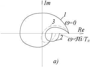 Рис.3.10. Визначення стійкості імпульсної системи Критерій Найквіста для імпульсних систем формулюється так же, як і для неперервних: система стійка, якщо годограф Імпульсний елемент не впливає на стійкість розімкненого контуру, але для замкненої системи необхідно врахувати таке: - при малих періодах повторення Tn частотна характеристика розімкненого контура співпадає з частотною характеристикою неперервної частини, яка визначає стійкість імпульсної системи; - при збільшенні періоду повторення в більшості систем зменшується граничний передаточний коефіцієнт, погіршуються динамічні властивості; - в окремих випадках (структурно-нестійкі неперервні системи, системи із запізнюванням) імпульсний елемент справляє стабілізуючу дію. Для таких систем рекомендується обирати період повторення Tn з умови: