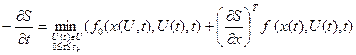 де: Рівняння Беллмана – специфічне диференціальне рівняння першого порядку в частинних похідних відносно однієї змінної Рівняння (4.49)-(4.51) виражають необхідну умову оптимальності керування і визначають порядок розв’язання задачі оптимального керування методом динамічного програмування. На першому етапі мінімізують вираз в правій частині, тобто диференціюють його за керуванням