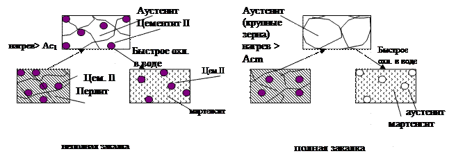 Нагрев > Ас3 на (30 – 50оС) при полной закалке позволяет получить мелкозернистый аустенит и, соответственно, после охлаждения – мелкокристаллический мартенсит. Нагрев > Ас1 на (30 – 50оС) при неполной закалке приводит к сохранению в структуре кристаллов доэвтектоидного феррита, что снижает твердость и прочность стали.