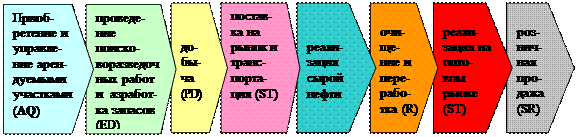 9.5.Приклади структур бізнес процесу. Приклад 1: нафтовий бізнес. Основна діяльність: 1. Маркетинг. Тут він особливо не потрібний, тому що ми вже знаємо, що нафта користається попитом. Можна уточнити щось і т.д. 2. Придбання прав на землю. 3. Розвідка і розробка запасів. Буріння. 4. Видобування і перевезення нафти. 5. Переробка. 6. Збереження запасів. 7. Оптовий продаж. 8. Роздрібний продаж на бензоколонках.