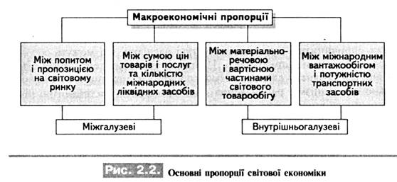 Основними пропорціями, які характеризують стан, закономірності й тенденції світового господарства, є співвідношення між попитом і пропозицією на світовому ринку; між сумою цін товарів і послуг у світовій торгівлі та кількістю міжнародних ліквідних засобів, що опосередковують рух товарних потоків і послуг; між матеріально-речовою і вартісною частинами світового товарообігу; між міжнародним вантажообігом і потужністю транспортних засобів, що забезпечують ці перевезення, та ін. В окремих сферах світового господарства формуються міжгалузеві та внутрішньогалузеві натуральні чи вартісні пропорції між видобувними й обробними галузями промисловості; між харчовою та легкою промисловістю і сільським господарством; між нафтохімічною і нафтодобувною промисловістю; між промисловістю з виробництва мінеральних добрив і сільським господарством тощо (рис. 2.2).