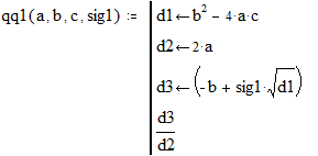 Приклад 1.2. Оформимо у виді програми-функції обчислення коренів квадратного рівняння ax2 + bx +c = 0 за формулою