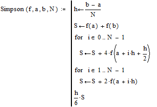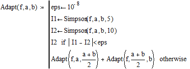 використовуючи формулу Симпсона з автоматичним вибором числа вузлів. При цьому програма-функція Simpson(f,a,b,N) обчислює визначений інтеграл по формулі Симпсона при фіксованому числі інтервалів N, а програма-функція Adapt(f,a,b) вибирає по заданій точності обчислення інтеграла (рівної 10-8 ) кількість інтервалів.