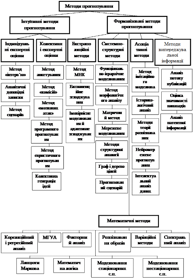 В літературі є велика кількість класифікаційних схем методів прогнозування. Пропонована схема класифікації методів прогнозування показана на рис. 1. Кожен рівень деталізації визначається своєю класифікаційною ознакою: ступенем формалізації, загальним принципом дії, способом отримання прогнозної інформації. За ступенем формалізації всі методи прогнозування поділяються на інтуїтивні та формалізовані. Інтуїтивне прогнозування застосовується тоді, коли об’єкт прогнозування або дуже простий, або настільки складний, що аналітично врахувати вплив багатьох факторів практично неможливо. У цих випадках вдаються до опитування експертів, Отримані індивідуальні та колективні експертні оцінки використовують як кінцеві прогнози або в якості вихідних даних в комплексних системах прогнозування. У виборі методів прогнозування важливим показником є глибина випередження прогнозу. При цьому необхідно не тільки знати абсолютну величину цього показника, але і віднести його до тривалості еволюційного циклу розвитку об’єкта прогнозування. Для цього можна використати запропонований В. Білоконем безрозмірний показник глибини (дальності) прогнозування (