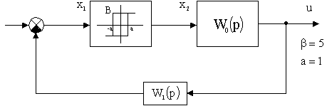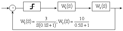 Тобто в системі існують автоколивання з частотою 4,7 рад/с і амплітудою 32. Приклад. Методом гармонічної лінеаризації визначити амплітуду й частоту автоколивань нелінійної системи.