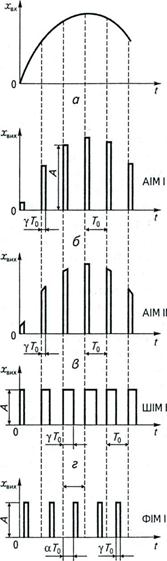 Крім того, розрізняють два роди модуляції залежно від того, чи змінюється модульований параметр протягом часу існування імпульсу. Якщо модульований параметр не змінюється, то імпульсна модуляція належить до першого роду (ІМ І), якщо ж модульований параметр змінюється відповідно до поточного значення модулюючого сигналу, то до другого роду (ІМ II). Залежно від виду і роду імпульсної модуляції імпульсні елементи підрозділяються на амплітудні, широтні і часові першого або другого роду.