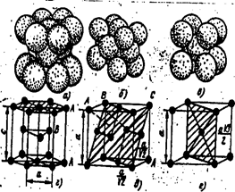 Рис. 2.1 Элементарные ячейки кристаллических решеток: а, г -ГП; б, д - ГЦК; в, е - ОЦК Кристаллы характеризуются тремя критериальными свойствами: однородностью, анизотропностью и способностью самоограняться. Однородность - свойство физического тела быть одинаковым во всем объеме. Анизотропность (неравносвойственность) – особенность однородного тела, заключающаяся том, что свойства тела одинаковы в по параллельным направлениям и неодинаковы по непараллельным направлениям. Способность самоограняться – свойство кристалла принимать правильную многогранную форму при определённых условиях роста.