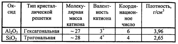 Плотность кристаллических решеток оксидов очень высока, так как пустоты, образуемые ионами, частично или полностью заполнены катионами. Кроме того, при одинаковой упаковке атомов плотность зависит от молекулярной массы оксида. При равных молекулярных массах, например в силикатах, решающее значение имеет координационное число и валентность катиона. для примера сравним характеристики двух оксидов: А12O3 и SiO2 (табл. 4.2). Из таблицы следует, что в соединениях, имеющих плотную кри сталлическую упаковку и примерно равные молекулярные массы катионов, решающее влияние на плотность оказывают более низкая валентность катиона и высокое координационное число. Таблица 4.2. Строение оксидов и их плотность