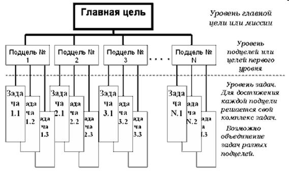 Графические методы Графические представления позволяют наглядно отработать структуру моделируемых систем и процессов, происходящих в них. В этих целях используются графики, схемы, диаграммы, гистограммы, древовидные структуры и т.д. Дальнейшим развитием графических методов стало использование, в частности, теории графов и возникших на ее основе методов календарно-сетевого планирования и управления. Метод структуризации позволяют разделить сложную проблему с большой неопределенностью на более мелкие, лучше поддающиеся анализу. В качестве особого метода структуризации можно выделить метод «дерева целей». Метод «дерева целей». Идея метода дерева целей была предложена У. Черчменом в связи с проблемами принятия решений в промышленности. Термин «дерево» подразумевает использование иерархической структуры, получаемой путем расчленения общей цели на подцели, а их, в свою очередь, на более детальные составляющие, которые в конкретных приложениях называют подцелями нижележащих уровней, направлениями, задачами проблемами, а начиная с некоторого уровня – функциями. Как правило, термин «дерево целей» используется для иерархических структур, имеющих отношения строгого (древовидного) порядка, но иногда применяется и в случае «слабых» иерархий. Поэтому более правильным является термин В.М. Глушкова «прогнозный граф», однако в силу истории возникновения метода более распространен термин «дерево целей».