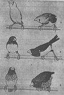 Рис. 7.6. Эволюция демонстрации «поклона» у различных видов зябликов. А) ткачик зебровый, б) полосатый зяблик, в) оттеночный зяблик