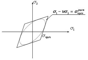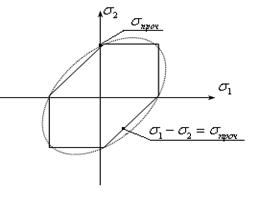 Предельная поверхность примет вид, изображенный на рисунке 11.14 в виде многоугольника. Вторая теория плохо коррелирует с экспериментом. 11.5.3.Третья теория прочности (теория максимальных касательных напряжений ) Эта теория удовлетворительно согласуется с экспериментами над материалами, у которых пределы прочности на растяжение и сжатие одинаковы (например, для стали). Согласно III теории, утверждается, что разрушение наступит тогда, когда в каком-то элементе
