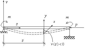 Снова рассмотрим изгиб балки под действием продольной центральной силы Р, но предварительно изогнутой приложенными по концам сосредоточенными моментами m (см. рис. 17.12). Этот момент может быть вызван внецентренным нагружением продольной силой Р, если он имеет эксцентриситет е, то m=Ре.