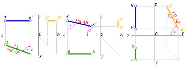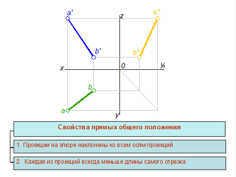 При этом прямые, параллельные одной из плоскостей проекций называются прямыми уровня. Прямые, перпендикулярные одной из плоскостей проекций называются проецирующими прямыми. Так как проекцией прямой линии на плоскости всегда является прямая линия (рис. 2.2), то для построения проекций отрезка прямой достаточно построить проекции его концов и соединить одноименные проекции концов прямыми. Проекции отрезка прямой общего положения на эпюре наклонены ко всем осям проекций (рис. 2.3) и каждая из проекций всегда меньше длины самого отрезка. Отрезок, параллельный одной из плоскостей проекций, проецируется на эту плоскость в натуральную величину (рис. 2.4). Положение проекции на этой плоскости по отношению к осям зависит от положения самого отрезка по отношению к плоскостям. На две другие плоскости такой отрезок проектируется в виде отрезков, параллельных осям.