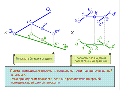 Точка принадлежит плоскости, если она расположена на прямой, принадлежащей плоскости. Поэтому чтобы показать на эпюре точку в плоскости, надо сначала в плоскости провести прямую, а затем на прямой взять точку.