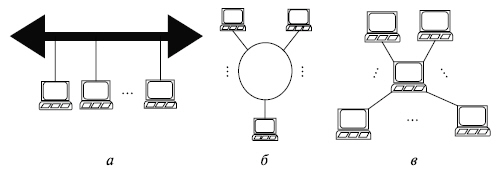 В некоторой линии можно образовать несколько каналов связи, по каждому из которых передается своя информация. При этом говорят, что линия разделяется между несколькими каналами. Существуют два метода разделения линии передачи данных: временное мультиплексирование (иначе — разделение по времени, или TDM — Time Division Method), при котором каждому каналу выделяется некоторый квант времени, и частотное разделение (FDM — Frequency Division Method), при котором каналу выделяется некоторая полоса частот. В САПР небольших проектных организаций, насчитывающих не более единиц-десятков компьютеров, которые размещены на малых расстояниях один от другого (например, в одной или нескольких соседних комнатах), объединяющая компьютеры сеть является локальной. Локальная вычислительная сеть (ЛВС), или LAN (Local Area Network), имеет линию связи, к которой подключаются все узлы сети. При этом топология соединений узлов (рис. 5.2) может быть шинная (bus), кольцевая (ring), звездная (star). Протяженность линии и число подключаемых узлов в ЛВС ограничены.
