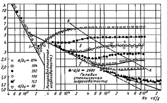 Характер влияния этих двух параметров на сопротивление труб отчётливо виден из графика, который является результатом опытов И.И. Никурадзе.