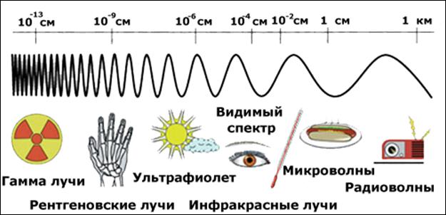 Рис. 4. Спектр электромагнитных волн. Конечными источниками информации для наших органов зрения являются исключительно электромагнитные волны, наше осязание кожей, кроме случаев опосредованного ощущения “тепло/холодно”, происходит в непосредственном контакте с другими вещественными предметами. Вещество способно стабильно хранить информацию, а поля способны быстро и далеко ее переносить. Предельная скорость распространения поля в вакууме равна скорости света (с ≈ 3×1010 см / сек). Процесс распространения полей есть волновой (колебательный) процесс.