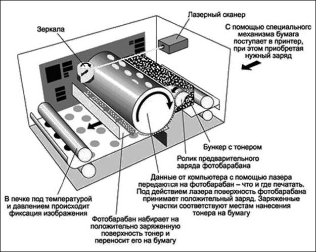Рис. 33. Устройство лазерного принтера. Также обладающий электростатическим зарядом тонер (красящий порошок) притягивается к поверхности барабана, сохранившей скрытое изображение. После этого барабан прокатывается по бумаге, и тонер переносится на бумагу. Потом бумага проходит через блок термозакрепления (печку) для фиксации тонера, а фото-барабан очищается от остатков тонера и разряжается. Основные производители: Hewlett-Packard, Samsung, Cannon.