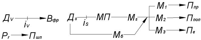 Муфтами Мs и Мб включается рабочая подача или быстрое перемещение движения, включённого одной из трёх муфт М. Реверсирование подач выполняется электродвигателем Дs. Бесконсольный вертикально-фрезерный станок мод. 654 имеет тоже две кинематические группы (рис. 25).
