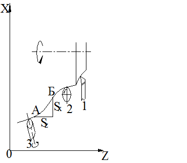 Такой профиль может быть обработан различным режущим инструментом: резцом 1 с точечной режущей кромкой (если это тело вращения); цилиндрической фрезой 2 с осью, расположенной перпендикулярно плоскости заготовки; пальцевой фрезой 3 с осью, расположенной в плоскости заготовки. Однако разнообразие вариантов обработки и возможность использования различного инструмента могут быть получены ограниченным числом формообразующих движений. Возможно лишь три варианта: движение заготовки относительно неподвижного инструмента; движение инструмента относительно неподвижной заготовки и совместное их движение. Выбор варианта происходит при проектировании станка и влияет на разработку его системы управления. Рассматривая сложное формообразование, его можно представить состоящим из простых движений, каждое по своим направляющим (координатным перемещениям). Обработка элемента сложной траектории (участок А–Б) произойдет при одновременном перемещении в продольном направлении на расстояние Sz и поперечном на расстояние Sx. Управление станком можно представить, как процесс воздействия на него для обеспечения выполнения требуемого технологического процесса обработки детали с заданными точностью, производительностью и себестоимостью обработки. Оно может осуществляться вручную – человеком или без участия человека – системой автоматического управления (САУ). При управлении станками вручную обеспечиваются большая универсальность и высокая мобильность. Однако управление станком вручную значительно ограничивает возможность повышения производительности обработки, а во многих случаях также снижает или делает нестабильной точность обрабатываемых деталей. При применении САУ управление станком производится на основе заранее разработанной программы, воплощенной в программоноситель (кулачках, копире, перфоленте и др.). Система автоматического управления (САУ) представляет собой комплекс устройств и средств связи, обеспечивающих точное и согласованное во времени взаимодействие рабочих и вспомогательных исполнительных механизмов станка в соответствии с программой управления, разработанной на основе принятого технологического процесса обработки. Программа управления – это последовательность команд, обеспечивающих заданное функционирование рабочих органов станка. Элемент или комплекс элементов, несущих на себе программу управления, называется программоносителем. Варианты исполнения САУ приведены на рис. а, б, в.