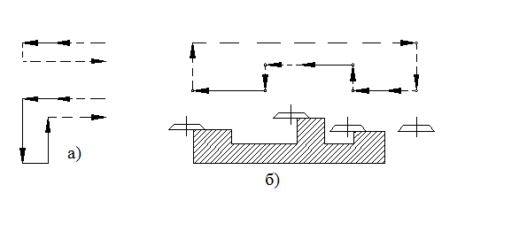 На рисунке а) показаны возможные циклы перемещений суппортов на токарном станке с системой ЦПУ, а на рисунке б) цикл перемещений стола и шпиндельной бабки на фрезерном станке с системой ЦПУ (сплошными линиями показаны рабочие, а штриховыми – холостые ходы).