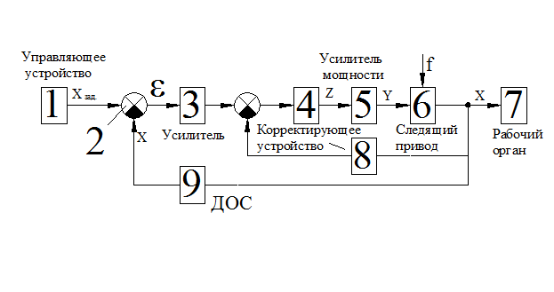 При применении следящей системы (см. рис.) управляемый рабочий орган 7 (например, шпиндельная бабка с фрезой) с помощью силового следящего привода 6 (например, гидроцилиндра с поршнем) автоматически воспроизводит движение, задаваемое управляющим устройством 1 (например, копиром). Сигнал управления вырабатывается сравнивающим устройством 2, получающим информацию о требуемом положении рабочего органа 7 от управляющего устройства 1 и о его действительном положении с помощью отрицательной обратной связи 9. Последняя называется так, потому, что управляющий сигнал На силовой следящий привод помимо реакции со стороны рабочего органа станка (процесс резания, силы трения) действует внешнее возмущение Сигнал рассогласования Следящие системы управления могут быть непрерывными и дискретными, а так же линейными и нелинейными. Важнейшими показателями работоспособности и качества следящей системы управления является устойчивость ее работы, точность и быстродействие. Устойчивость определяет работоспособность систем, а быстродействие влияет на динамическую точность и производительность станка. Под устойчивостью следящей системы управления понимается ее способность возвращаться к установившемуся состоянию после прекращения воздействий, которые вывели систему из этого состояния.
