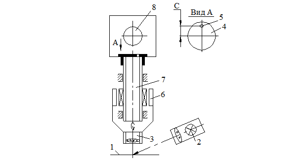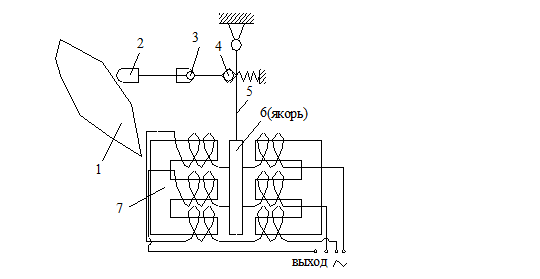 Примером электрической следящей копировальной системы является схема копировального прибора с индуктивным датчиком, показанная на рисунке. Щуп 2 благодаря шарнирной опоре 3 может перемещаться копиром 1 в осевом направлении и отклоняться на небольшой угол. На конце щупа
