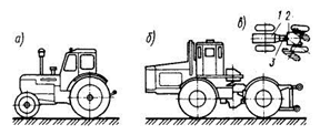 Рис. 3. Пневмоколесные тракторы а) с передними управляемыми колесами; б) со всеми управляемыми колесами и шарнирно сочлененной рамой; в) рама; 1 – передняя полурама; 2) – задняя полурама; 3 – универсальный шарнир.