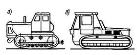 Рис. 4. Гусеничные тракторы а) с передним расположением двигателя; б) с задним и средним расположением двигателя