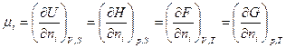Химический потенциал. В ходе химических процессов происходит не только изменение таких параметров ситемы, как обьем, давление и температура, но также изменяется состав. в приложении к таким системам для расмотрения равновесия Гиббс предложил использовать представление о химическом потенциале, который обозначается букой Математически химические потенциалы представляют собой частные производные характеристических функций по числу молей данного компонента системы при постоянных значениях независимых параметров и количеств всех остальных компонентов.: