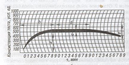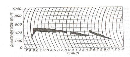 Фаринограф можно использовать для изучения структурно–механических свойств теста во время замеса, а также в процессе брожения или автолиза. При этом замешивают тесто с внесением дрожжей и других добавок. После замеса определённой длительности (10 мин) месилку останавливают и оставляют тесто на брожение, обминая его после каждого часа созревания в течение определённого времени. На рисунке 6 приведена фаринограмма двухчасового брожения теста, замешанного из муки, воды, дрожжей. Первый отрезок кривой характеризует изменение реологических свойств теста в процессе замеса в течение 10 мин. Первый интервал соответствует первому часу брожения теста. Следующий за этим отрезок характеризует реологические свойства теста в процессе первой его пятиминутной обминки; второй интервал соответствует второму часу брожения, после чего идёт кривая второй обминки.