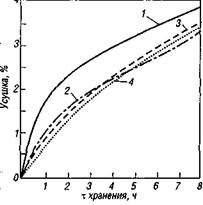 Рисунок 17 - Влияние скорости движения воздуха на усыхание хлеба: 1 - 0 м/с; 2 – 0,3 м/с; 3 - 1 м/с; 4 - 2 м/с. Данные графика, характеризующего влияние различной скорости воздуха (при 20 0С) на усыхание хлеба, свидетельствуют о том, что повышение скорости воздуха способствует ускорению охлаждения хлеба и снижению потери на его усыхание в среднем на 0,5-0,7%. Опыты, проведенные лабораторией кондиционирования воздуха ВНИИХПа на производственной опытной установке (в специальной камере для вагонеток с хлебом, снабженной оборудованием для кондиционирования воздуха), подтвердили целесообразность применения такого рода устройств (охладителей или кулеров), позволяющих ускорить охлаждение хлеба и снизить его усушку на 0,5-0,9%. Влажность и упек хлеба. Исследованиями ГосНИИХП было показано, что чем выше влажность изделия, тем выше его усушка, при прочих равных условиях. Так, увеличение влажности мякиша ржаного хлеба из обойной муки на 2% вызывало увеличение усыхания хлеба: за 4 ч - на 0,26-0,42%, а за 7 ч - на 0,42-0,50%. Установлено, что между упеком и усушкой изделия существует обратная зависимость: чем больше упек, тем меньше усушка, и наоборот. Способ выпечки хлеба (в формах или на поду). Подовый хлеб имеет более высокий упек и более низкую влажность, чем формовой хлеб той же массы. Поэтому усушка формового хлеба больше по сравнению с подовым. Объем и масса хлеба. Чем больше удельный объём хлеба, тем выше его усушка. Чем больше масса изделия, тем меньше его усушка. Способ хранения хлеба. Л. Я. Ауэрманом было установлено, что при хранении хлеба в ящиках со сплошными стенками, его усушка выше по сравнению с хлебом, хранившемся на стеллажах, имеющих свободное омывание воздухом. Это объясняется тем, что температура воздуха между штуками хлеба в ящиках выше, чем окружающего воздуха в остывочном отделении (рис.).