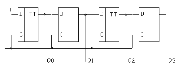 Информация поступает на вход Т.. С приходом первого тактового импульса старший разряд вводимого числа записывается в первый триггер. После прихода второго тактового импульса, старший разряд вводимого числа, который находится на входе второго триггера, переписывается на его выход. На выходе первого триггера появляется следующий разряд двоичного числа. Третий импульс переписывает старший разряд на выход второго, т.е. осуществляется сдвиг записанной информации на один разряд вправо. Аналогичным образом записываются следующие разряды и естественно, что 4х-разрядное число можно записать с помощью 4х тактовых импульсов. Пятый тактовый импульс, осуществляя сдвиг информации вправо, приводит к потере информации о старшем разряде.