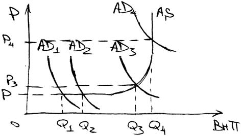 1. Ситуация А: если AS и AD пересекаются на кеймсианском отрезке, то такое равновесие не сопровождается изменением цен. Если AD1 увеличится до AD2, то увеличивается ВНП, а Q1 до Q2 при P=const.