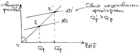 Классическая модель макроравновесия. Классическая экономическая школа в лице Жана Батиста Сэйа исходила из саморегуляции рыночной экономики (цены гибко реагируют на изменение спроса и предложения, в результате экономика автоматически возвращается к естественному уровню). Классика исходили из принципа предложения, т.е. предложение рождает дополнительный спрос, всё, что сберегается (S), инвестируется в производство(I), и как результат сбережения равны инвестициям (S=I), в такой экономике кризисы не возможны. В 1825г. вопреки прогнозам классиков произошол первый экономический кризис производства. Переодическое повторение кризисов каждые 8-10 лет, сделало необходимым пересмотреть постулаты классической модели. 58. Кейнсианский подход к макроравновесию. Принципиально новый подход был предложен Джоном Мейнардом Кейнсом в работе «общая теория занятости». Кейнс подверг сомнению тезис «об автоматической регуляции рынка» и обосновал необходимость государственного регулирования рыночной экономики. Во-вторых, на первое место Кейнс ставил спрос, а не предложение: ∆AD рождает ∆AS. В-третьих, инвестиции не равны сбережениям, т.к. те, кто инвестирует, и те, кто сберегают, - это разные люди. В-четвёртых, линия AD имеет восходящую направленность (у классиков она убывает). Модель макроэкономического равновесия Кейнса получила название кейнсианский крест.