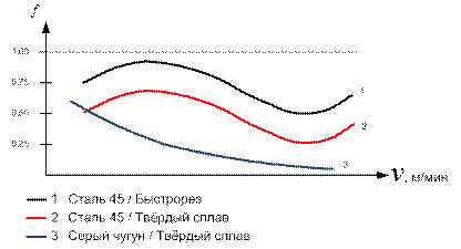 Зависит от: - нормального давления на контактных площадках; - скорости относительного скольжения; Для разных обрабатываемых материалов: