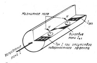 Рассмотрим действие поверхностного эффекта и эффекта близости в коаксиальных парах и определим характер распределения плотности токов в проводниках при различных частотах. В результате взаимодействия вихревых токов с основным током происходит перераспределение тока по внутреннему проводнику. Плотность тока к периферии проводника больше Iрезульт. Данное явление называется поверхностный эффект он растет с ростом