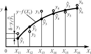 В данном пункте рассматривается идея основного (для количественных факторов) метода обработки результатов эксперимента с целью получения математического описания объекта – метода наименьших квадратов. Для простоты рассмотрим случай варьирования единственного фактора