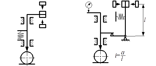 Рычажные датчики, как правило, сложны и имеют большие размеры по сравнению с безрычажными. Передаточное отношение этих датчиков обычно не превышает 50. С его увеличением снижается погрешность настройки микрометрических винтов, но возрастает число передаточных звеньев, что в свою очередь вносит некоторые дополнительные погрешности. Дополнительные передаточные звенья, кроме того, увеличивают динамические погрешности. Применение рычажных датчиков с большими i целесообразно в случае оснащения последнего звена не только контактами, но и стрелкой-указателем для визуального отсчета. Рычажные схемы датчиков позволяют сконструировать и многоконтактные системы для многодиапазонной рассортировки изделий. Большинство конструкций рычажных датчиков имеет один передаточный рычаг. Погрешность контроля при i рычагах составит