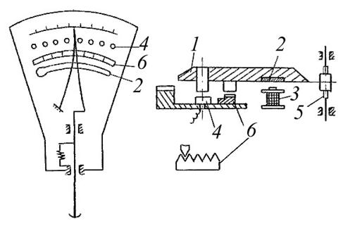 Сортировочный датчик БВ-929 с электромагнитным управлением, разработанный в Бюро взаимозаменяемости (БВ), позволяет простыми методами производить сортировку деталей на большое число групп. Принципиальная схема датчика изображена на рис. 2.8. Стальная пружина 1, закрепленная в виде консольной балки, притягивается электромагнитом 2. Величина прогиба пружины зависит от притягивающей силы электромагнита, которая в свою очередь зависит от величины тока, протекающего через обмотку электромагнита. На свободном конце пружины укреплен контакт 3. На измерительном стержне 6 помещен второй контакт 4. Замыкание контактов регистрируется с помощью электрической лампочки 5. Ток, протекающий через обмотку электромагнита, поступает от источника питания 10, регулируется элементом 8 и контролирующим прибором 9. Размер контролируемого изделия 7 определяет положение контакта 4, а ток, протекающий через обмотку электромагнита, определяет прогиб пружины 1, то есть положение контакта 3. При определенном токе, протекающем через обмотку, контакты замкнутся. Таким образом, размер изделия и величина тока взаимосвязаны, что позволяет сортировать изделия на большое число групп с высокой точностью. На практике изменение тока происходит путем переключения резисторов автоматической релейной цепочкой. При последовательном срабатывании звеньев релейной цепочки контакт на пружине датчика сближается с контактом на измерительном штоке, скачком перемещаясь на величину одной группы при срабатывании каждого последующего реле. Работа релейной цепочки мгновенно прекращается на том звене, на котором произошло замыкание контактов датчика. На светофорном табло при этом загорается лампа, сигнализирующая номер размерной группы. Одновременно с этим выдается команда на магнит, открывающий соответствующий ручей, куда направляется проконтролированная деталь. Пределы сортировки 0-0,2 мм. Минимальный размер группы 1,5-2 мкм. Погрешность сортировки ±0,5 мкм. На базе миниметра "Карл-Цейс" в Бюро взаимозаменяемости разработан многоконтактный рычажный датчик мод. БВ-6048 (рис. 2.9). Стрелка 1 несет на себе пластину-якорь 2 и в спокойном состоянии притягивается электромагнитом 3, замыкая соответствующий контакт ряда 4. Указатель-стрелка 1 с магнитным якорем крепится при помощи плоской пружины к оси 5. При включении электромагнита 3 стрелка притягивается и замыкает один из контактов ряда 4. Для того, чтобы не замкнулось сразу два контакта, служат нож и гребенка 6. Стрелка остается притянутой до тех пор, пока под измерительный стержень не поступит следующая деталь. После притягивания стрелки на контакты датчика подается ток и выдается команда на отнесение детали к определенной сортировочной группе. Подача тока на контакты датчика в тот момент, когда они замкнуты, уменьшает их эрозионный износ и позволяет применять большую электрическую нагрузку (обычно подается напряжение до 40 В и ток до 0,5 А на замыкающиеся в движении контакты датчика).