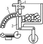 Таким образом, питатель является устройством, ориентирующим детали во времени. Необходимые перемещения подвижных элементов загрузочного устройства осуществляются приводом. Однако названные элементы ЗУ не всегда можно выделить в "чистом" виде при рассмотрении конкретного автомата. Некоторые элементы могут отсутствовать, либо один конструктивный элемент может выполнять несколько функций. Так, часто лоток выполняет одновременно и функции магазина. Необходимость магазина в составе загрузочного устройства объясняется тем, что производительность бункера из-за его конструктивных особенностей колеблется во времени, и для компенсации этого колебания приходится накапливать запас ориентированных деталей в магазине. Наиболее характерными элементами ЗУ являются бункер (или магазин) и питатель. Все ЗУ можно разбить на два вида: автоматические и полуавтоматические. Автоматические ЗУ обеспечивают автоматическую ориентацию деталей, как в пространстве, так и во времени. Характерная их особенность - наличие бункера. В бункерах ЗУ запас деталей в емкости размещается беспорядочно (навалом) (рис. 4.7). Эти ЗУ имеют сбрасыватель 1, захват 2 и лоток 3. Правильно ориентированные детали пропускаются в лоток, а неправильно ориентированные - сбрасываются в бункер.