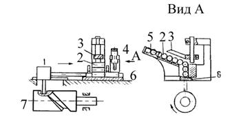 Магазин выполнен в виде наклонного лотка 5, куда вручную загружают ролики 2. Под действием собственного веса ролики скатываются на базирующую призму 6. Направляющая планка 3 служит для предотвращения заклинивания роликов. С помощью толкателя 1, приводимого в движение кулачком 7, ролик подается на измерительную позицию с датчиком 4. Бункерные и магазинные ЗУ в зависимости от способа перемещения деталей разделяются на самотечные, полусамотечные, принудительные и комбинированные. В самотечном ЗУ движение детали происходит под действием силы тяжести перемещаемых деталей; в полусамотечном ЗУ - под действием силы тяжести деталей при искусственном уменьшении силы трения между плоскостью детали и поверхностью ЗУ; в принудительных - принудительно под действием приводных механизмов; в комбинированных - непрерывно или периодически под действием приводных устройств. Загрузочные устройства в зависимости от их транспортных (несущих, захватных) устройств разделяются таким образом: 1) возвратно-поступательные; 2) поступательные; 3) возвратно-качательные; 4) вращательные; 5) вибрационные. Принципиальные схемы некоторых загрузочных устройств (рис. 4.9, 4.10):
