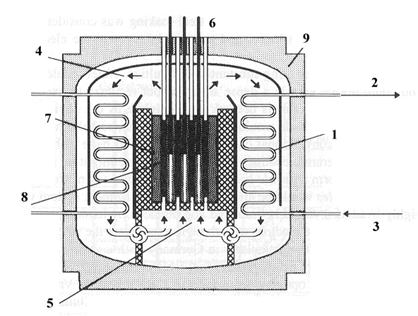 Схема устройства реактора AGR. 1 – парогенератор, 2 – выход пара на турбогенератор, 3 – конденсат, 4 – горячий углекислый газ, 5 – теплоноситель (углекислый газ), 6 – управляющие стержни, 7 – графитовый замедлитель, 8 –топливо (диоксид урана в нержавеющей стали), 9 – бетонный корпус Тяжеловодяные реакторы – имеется только один вид такого типа реакторов, канадский реактор CANDU. В качестве замедлителя используется D2O. Это делает CANDU наиболее эффективной системой в плане использования нейтронов.